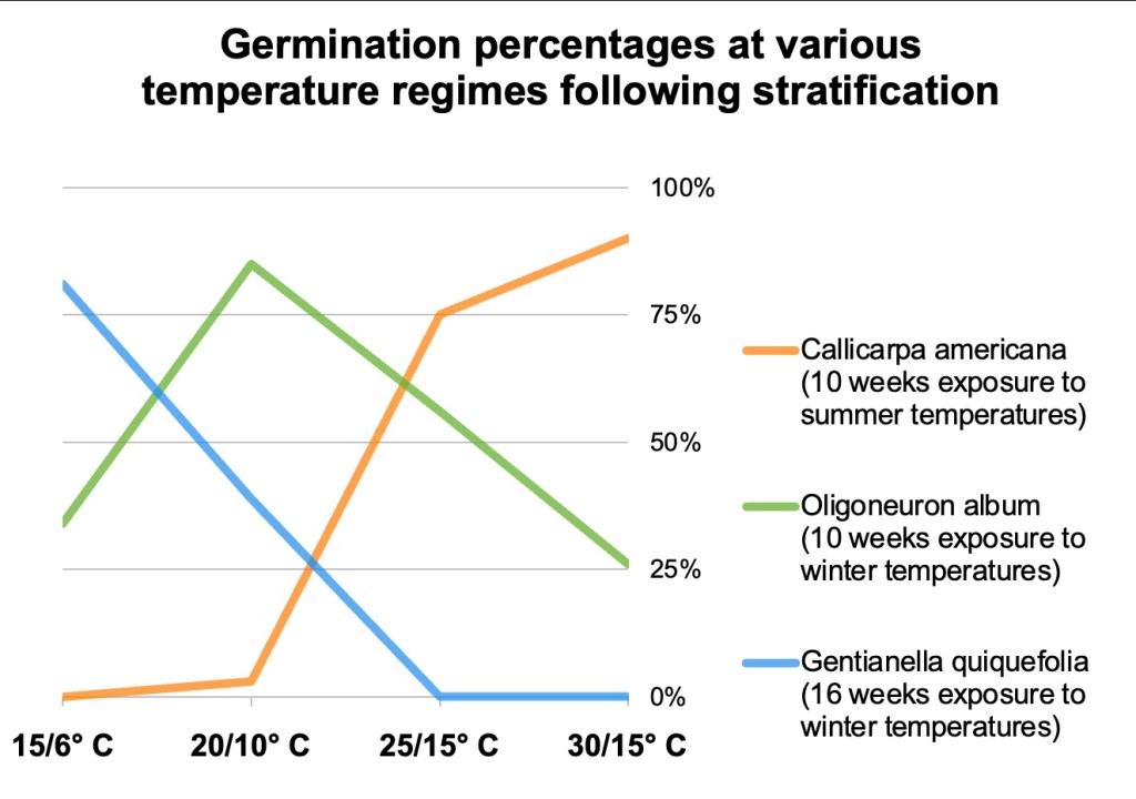 After pretreatment, seeds typically germinate best at one specific regime, but still germinate at other regimes (see figure 3). Gentianella quinquefolia favors cold regimes, with very high germination at 15/6° C, some germination at 20/10° C, and no germination at 30/15° C.7 Callicarpa americana, for its part, favors warm regimes with highest germination at 30/15° C, and no germination at 15/6° C.8 And others, like Oligoneuron album (formerly Aster ptarmicoides) favor the not-so-cold and not-so-hot 20/10°C regime, but shows some germination at all of the other temperature regimes.9