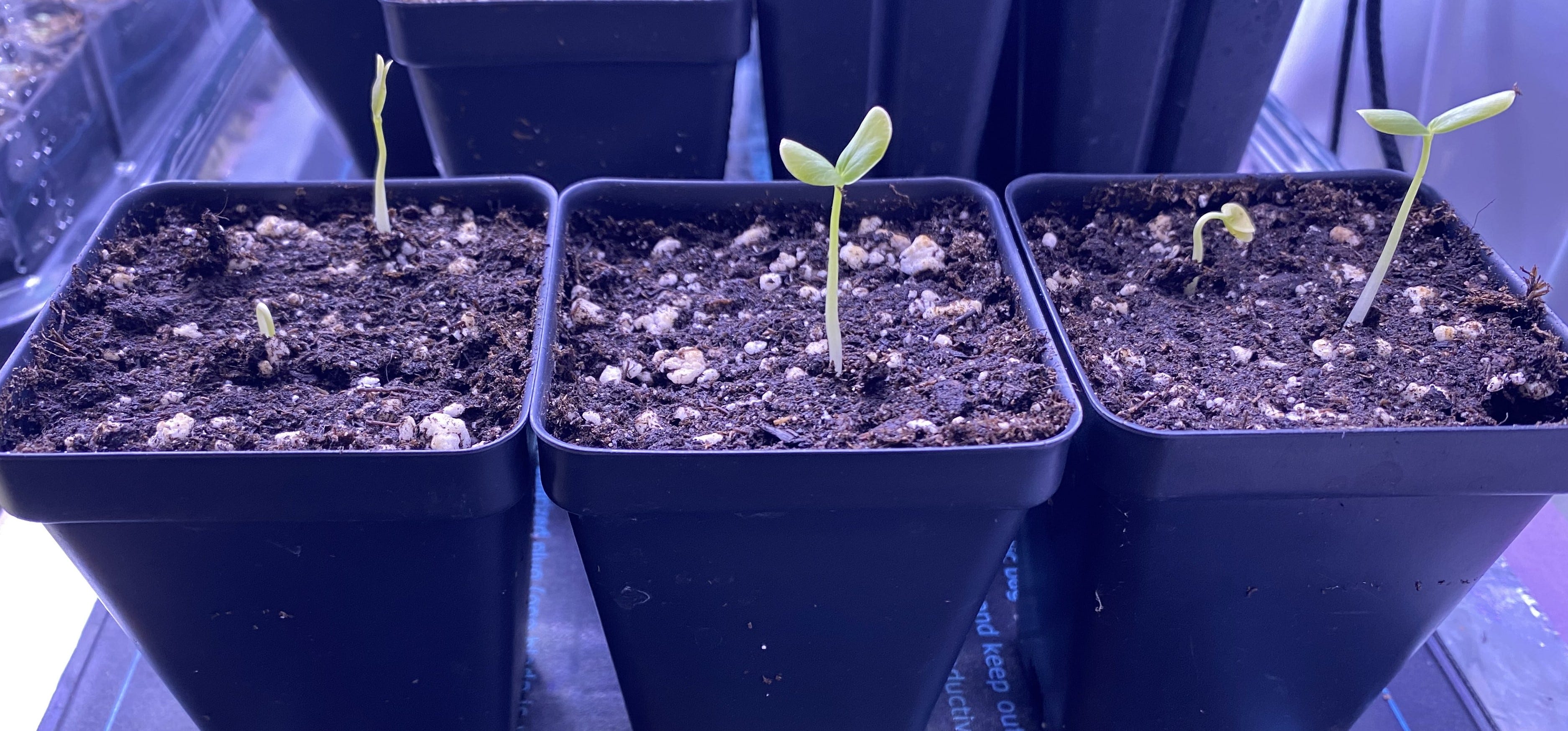 Once the seeds germinate, they need a fair amount of warmth to grow. My grow chamber was set to an alternating temperature regime of 20/10°C (read more about temperature regimes here), and the P. incarnata seedlings did not like those cold 10°C nights. So I moved them into my apartment, where the temperature fluctuates from 17°C to 24°C, and they grew at a rapid clip.