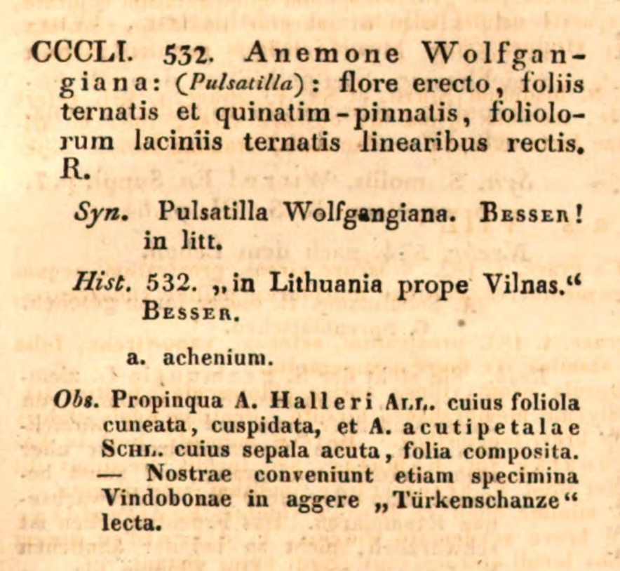 There are many synonyms for Pulsatilla nuttalliana, which can make it difficult to find information on it. Our trusted sources of botanical information can’t seem to agree on its name: Prairie Moon calls it Anemone patens var. wolfgangiana, Minnesota Wildflowers calls it Anemone patens, and the Lady Bird Johnson Wildflower Center calls it Pulsatilla patens ssp. multifida (though they also offer a helpful list of synonyms). Prairie Moon’s use of the epithet “wolfgangiana” is, according to Mosyakin (2016), inappropriate for the North American taxa of Pulsatilla, since the name Anemone wolfgangiana was given to a specimen collected in Lithuania (see figure 4). At any rate, Pulsatilla nuttalliana is now generally accepted as the botanical name (and aligns with the taxonomy of Wikipedia, Kew, and iNaturalist), so I’ll use that going forward.