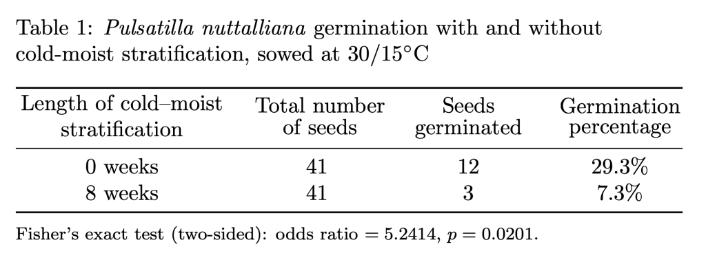 Last year I tested whether eight weeks of cold–moist stratification would increase germination of P. nuttalliana, in light of Greene and Curtis’s 1950 article claiming that two months of stratification yielded 98% germination rates.4 My experiment yielded the opposite result: the group of seeds given eight weeks of cold–moist stratification has statistically significantly less germination than the group sown without stratification (see table 1). So my experiment suggests that we shouldn’t waste time trying to stratify these seeds (and we shouldn’t plant them outside in the fall as Prairie Moon suggests).